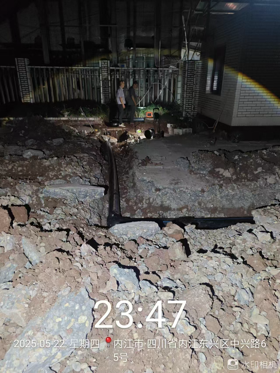 抢修现场,维修人员面对夜间视线不佳、高温作业、现场环境复杂等多重挑战,争分夺秒、迎难而上,通宵达旦开展抢修工作。次日凌晨3点58分,维修人员熊弈在工作群里发布消息:“东兴区政府DN150钢管因漏点在建筑下方无法维修,已从旁改管绕过漏点,160PE管改管约60米,63PE管改30米,加装50铜闸阀一只,现已修复通水。”至此,抢修工作圆满结束,恢复正常供水。