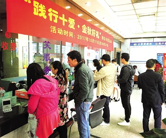 (以下简称“水司”)推出了一系列“惠民、便民”服务,希冀将温暖传递到家家户户…… 金秋十月,惠民万家 “请帮我预存800元……”“我要领口炒锅……”10月11日上午9时许,“水司”玉溪路收费厅里人潮涌动、热闹非凡。 窗口前,预存水费的用户群整齐划一地排着长队;登记处,工作人员井然有序地发放礼品、征集“作风效能建设征求意见表”;库房内,餐洗液、食用油、炒锅等礼品完好装箱存放,正“翘首以盼”地等待用户前来认领。 “惠”聚金秋,乐享好礼。据玉溪路收费厅组长周丽萍介绍,为感谢广大用户对城市供排水事业的长期支持及帮助,“水司”特精心策划、推出了为期21天的“金秋好礼”预存水费活动。即日起至10月31日,凡属“水司”供水区域内的生活用水户(一表一户),结清欠费后预存相应数额的水费,凭预存收据,便可现场领取相应的礼品回馈。 礼品为:预存200元,赠送雕牌餐洗一桶或其他;预存400元,赠送斑布生态竹纸一提或其他;预存600元,赠送金龙鱼葵花籽油(4L)一桶或其他;预存800元以上,赠送苏泊尔炖锅一口或苏泊尔炒锅一口。 活动一经启动,便获得广大用户的热烈反响。“今天上午,前来预存水费、领取礼品的用户络绎不绝。”周丽萍说,截止到当天10点半,仅玉溪路收费厅参与活动的用户就突破了130人;而平安路、大千路、交通路、白马镇四处同步推行活动的收费厅,累计登记430余名参与用户。 “前两天,小区里都在沸沸扬扬地传‘水司’将举办回馈活动。”家住市中区甜城大道某小区的用户张光华,今天特意抽空前来预存了800元水费,并领取了一口炒锅。“缴水费还能领礼品,这样的好事我一定会在朋友圈大力宣传,争取让身边更多人知晓。” 左手一口炖锅、右手一口炒锅。预存1600元,抱得礼物归,家住市中区临江路某小区的用户宋浩笑容满面:“对于用水户来说,这活动真的‘接地气’。”他希望,今后,“水司”能将类似的惠民传统长久地延续下来。 缴纳水费 不跑“冤枉路” “今后您随时随地,只要用手机就可以缴费了……” 近日,家住市中区临江路528号的黄女士,一如既往地来到“水司”玉溪路收费厅。当她在排队缴纳水费时,“意外”地受到“水司”客户服务部副经理樊晓丽的热情接待。 原来,“水司”已与中国建设银行网站(手机银行)、中国农业银行网站(手机银行)、中国工商银行网站(手机银行)、四川省农村信用社网站(手机银行)取得了合作,用户登录以上银行网站个人银行(之一),进入水费缴费界面便可缴纳水费。 此外,“水司”还相继开通了“中国电信翼APP”、“支付宝APP”缴费方式,用户登陆上述APP(之一),在主页