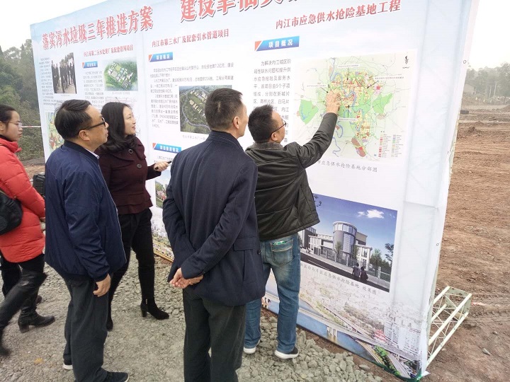 1128日,省环境保护厅副巡视员姚东升一行到内江,对落实污水垃圾三年推进方案落实情况进行调研。调研组先后来到了桐梓坝大桥至寿溪河口综合环境整治工程、谢家河黑臭水体整治、东兴区垃圾压缩站及环卫车辆专用停车场,最后来到我司第二污水处理厂建设施工现场进行实地调研。公司党委副书记、纪委书记、工会主席李涛在《落实污水垃圾三年推进方案,建设幸福美丽内江》展板前对项目推进情况作了详细汇报,并报告了下一步工作计划。