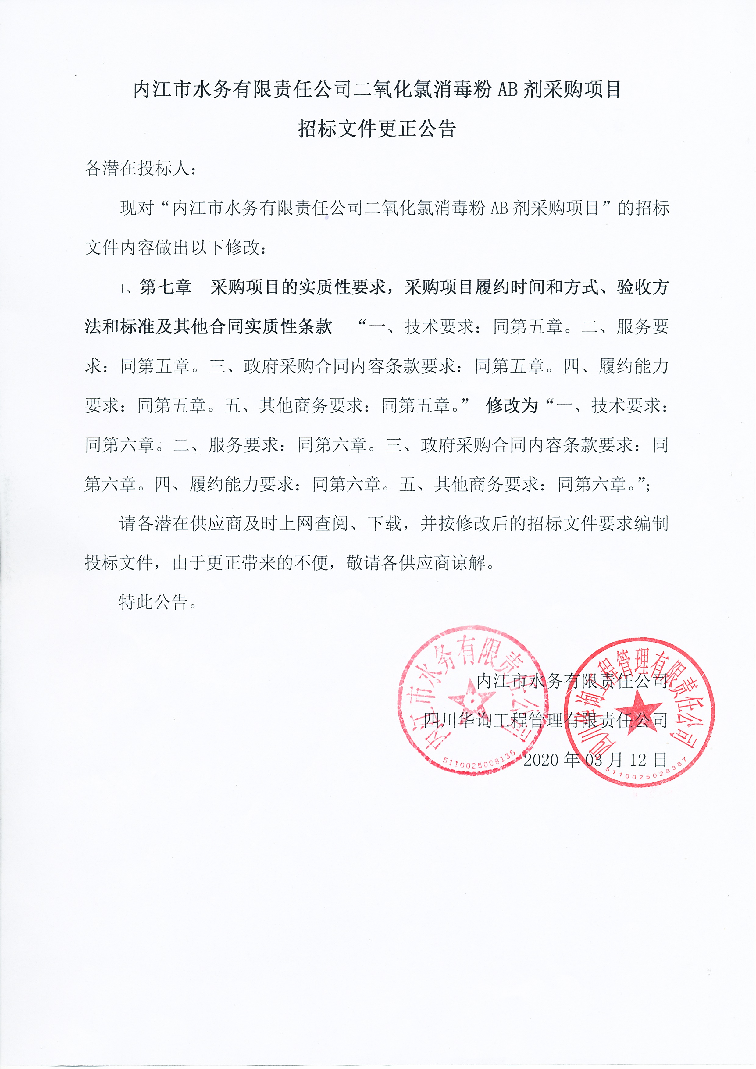 国产自拍 二氧化氯消毒粉AB剂采购项目招标文件更正公告