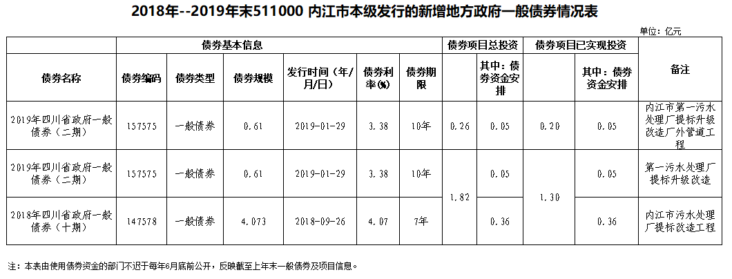 2018年--2019年末511000 内江市本级发行的新增地方政府一般债券情况表