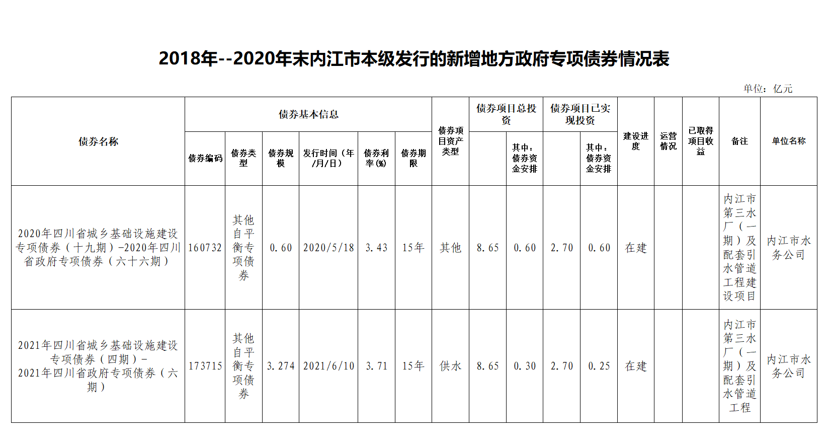 2018年--2020年末内江市本级发行的新增地方政府专项债券情况表