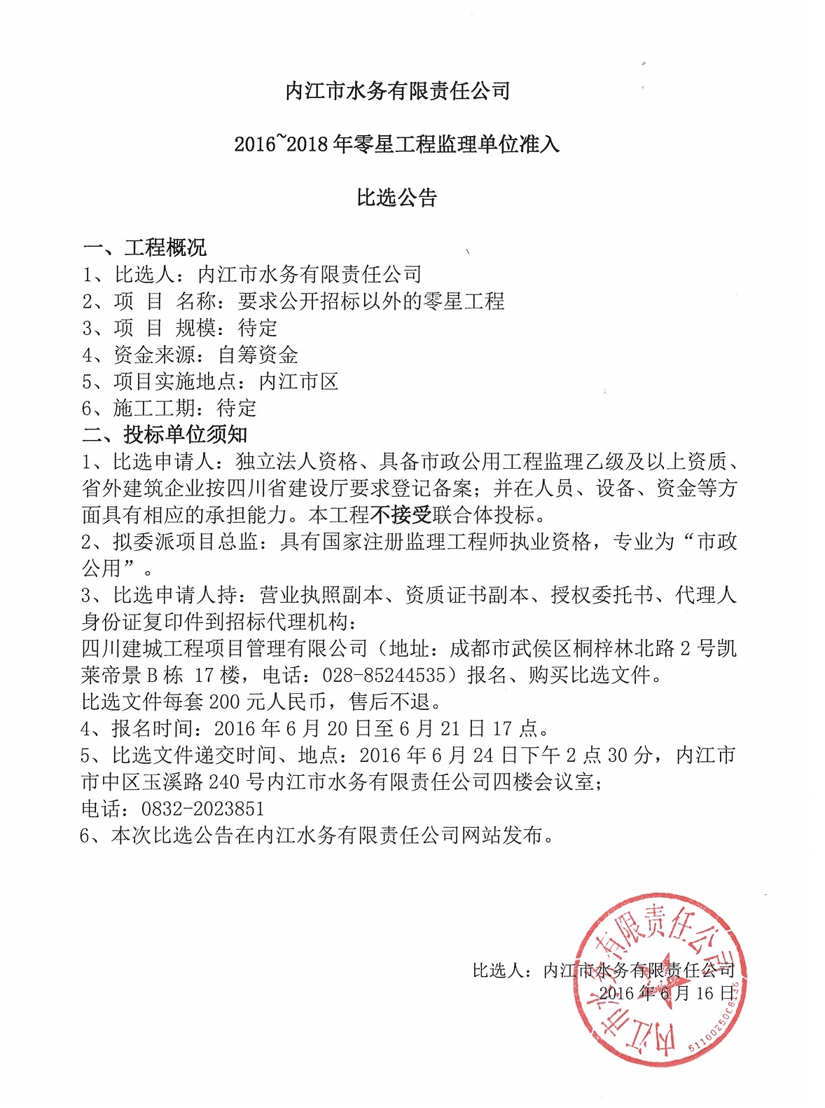国产自拍 2016~2018年零星工程监理单位准入比选公告