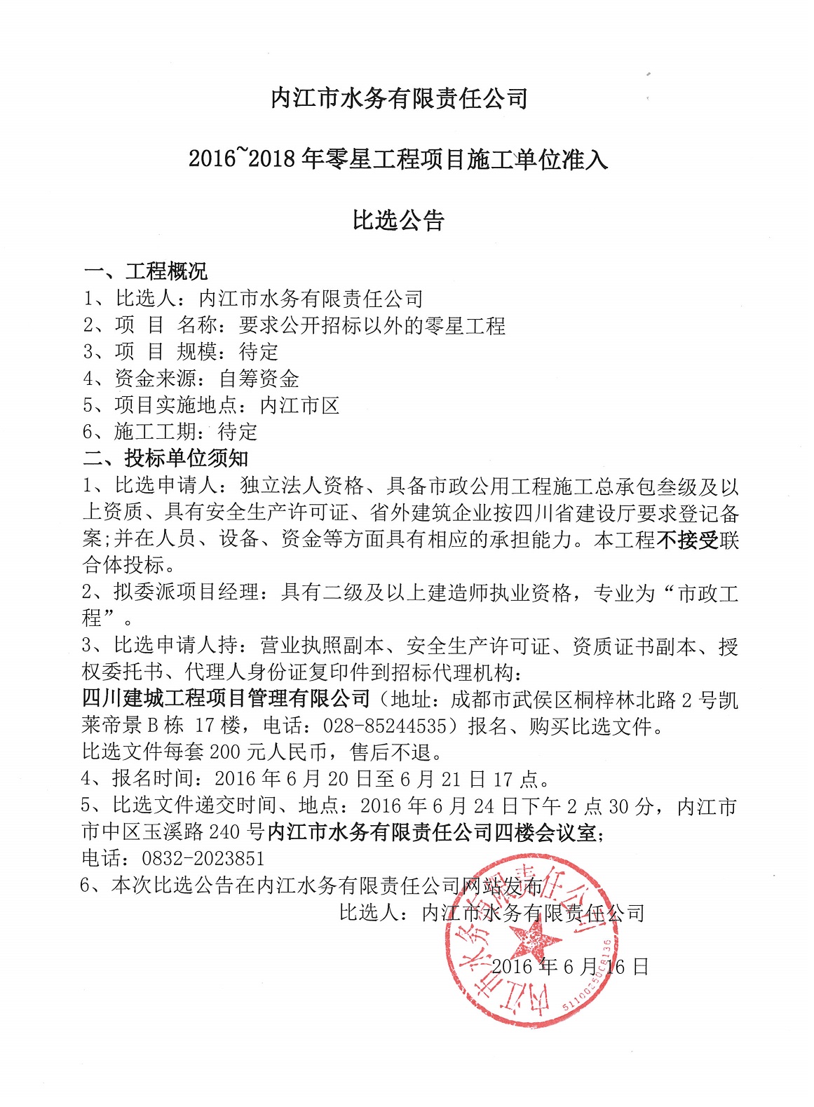 国产自拍 2016~2018年零星工程项目施工单位准入比选公告