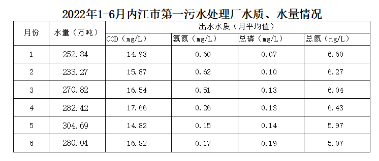 内江市污水处理有限责任公司第一污水处理厂2022年1-6月水量、水质情况