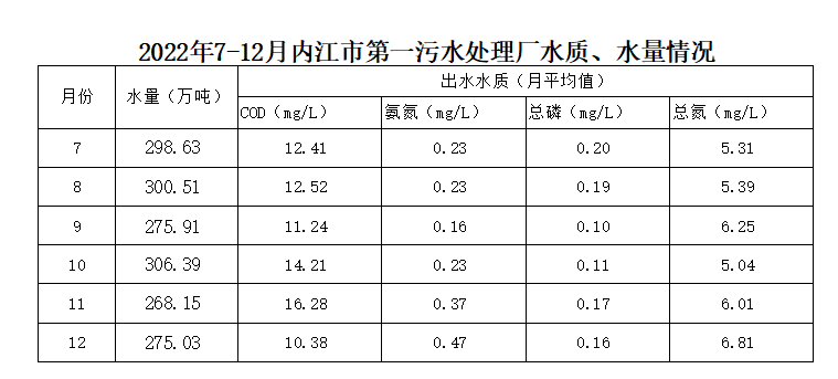 内江市污水处理有限责任公司第一污水处理厂2022年7-12月水量、水质情况