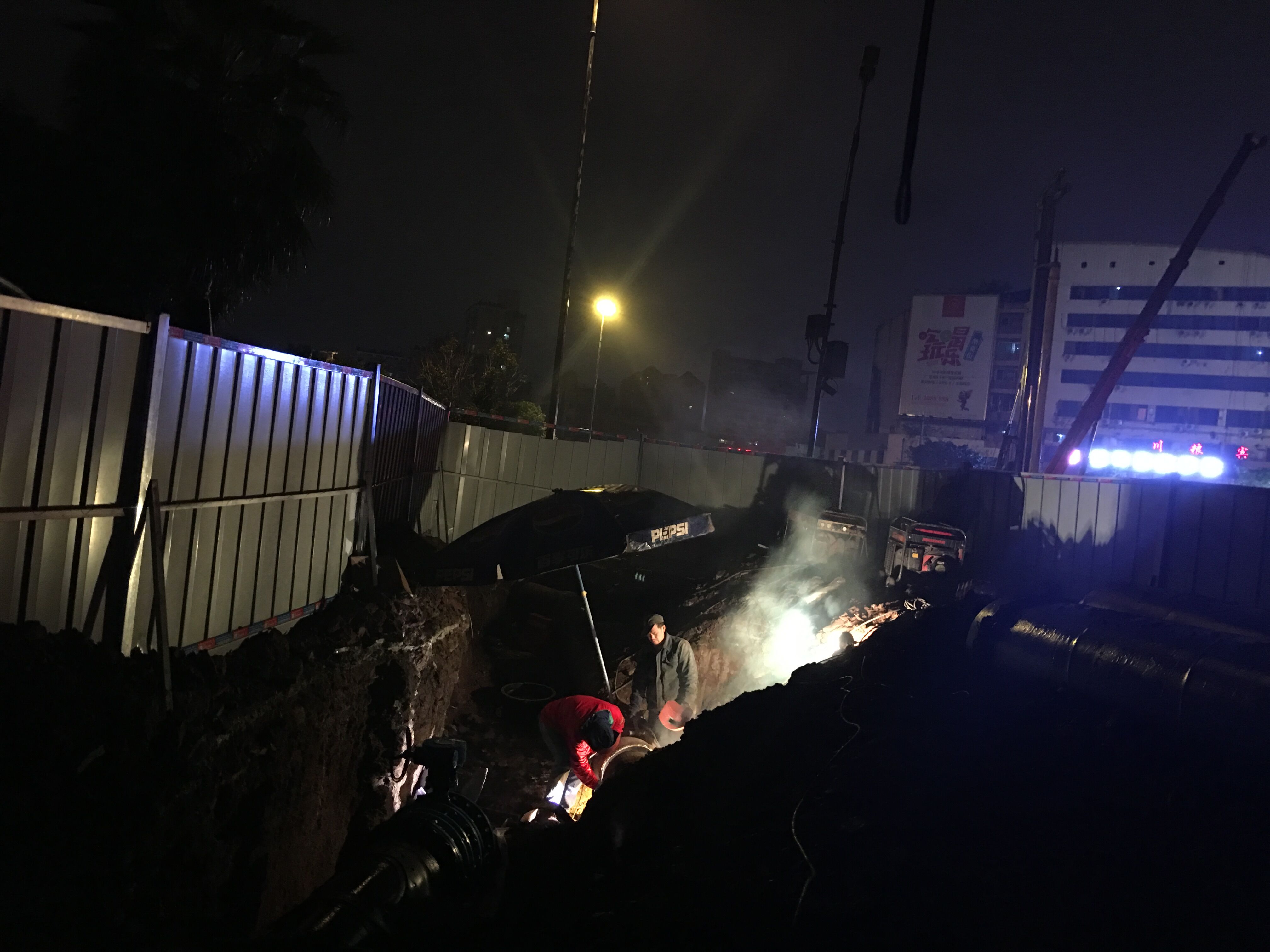 国产自拍 为配合西林大桥南北下穿工程顺利进行,积极组织豪盛安装公司、工程管理部、管网运行部等相关部门进行西林大桥南北桥头下穿DN500给水管道改造。为保证附近居民白天的正常用水,我司特意把工期定在晚上和凌晨。2016年11月22日晚上11点多,阴雨绵绵,寒风刺骨,公司党委副书记、纪委书记、工会主席李涛带领党群工作部提上凉菜、面包和牛奶到施工现场慰问挑灯夜战、顶风作业的加班人员。他们不畏严寒、不知饥饿,只为不影响居民正常生活、保证城市安全供水埋头苦干的水务人,让我们不得不心生敬意。