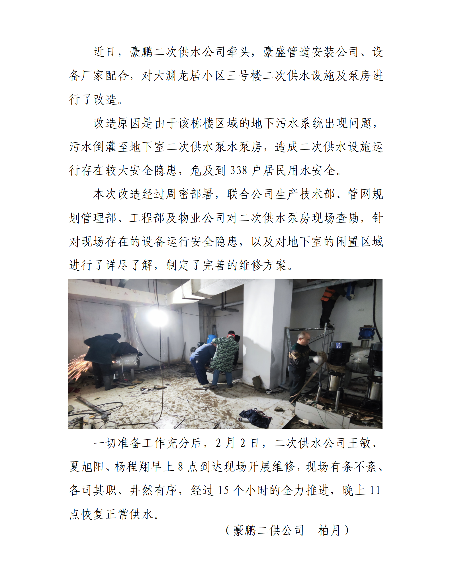 豪鹏公司牵头对大渊龙居小区二次供水设施及泵房进行改造