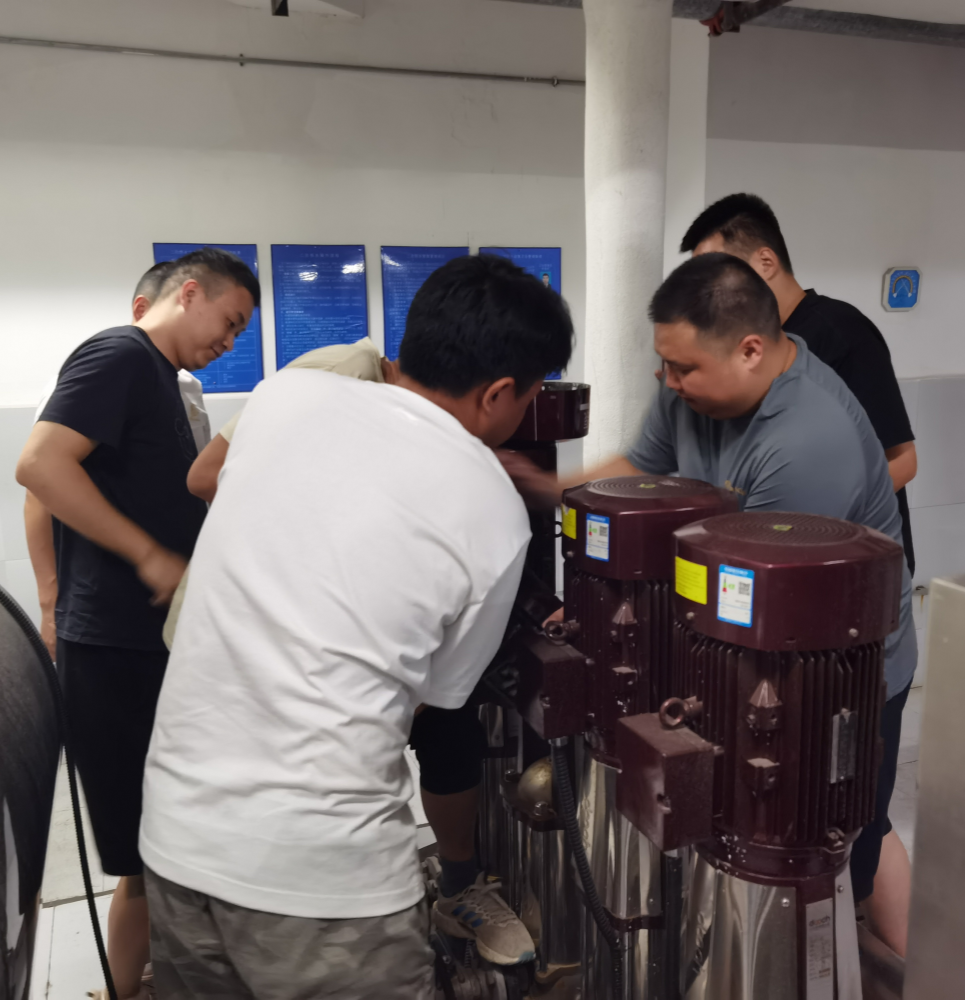 6月中旬,该小区有用户反映水压不稳定。豪鹏二次供水公司收到信息立即组织人员前往现场排查,确认是一台水泵电机出了故障,引发电压波动所致。面对突发情况,公司迅速响应,立即组织人员对故障电机进行拆解维修。6月17日下午,维修工作进入电机重新安装的关键阶段,公司抓住这次实战机会,组织5名青年员工参与到此次技术练兵。通过此次培训,员工们不仅掌握了电机维修与安装的相关理论和维护技巧,更在实战中深化了对二次供水设施运行原理的理解。