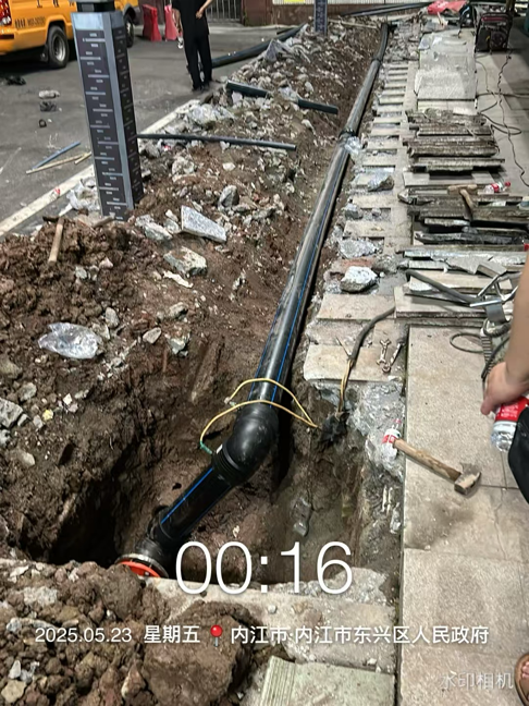 抢修现场,维修人员面对夜间视线不佳、高温作业、现场环境复杂等多重挑战,争分夺秒、迎难而上,通宵达旦开展抢修工作。次日凌晨3点58分,维修人员熊弈在工作群里发布消息:“东兴区政府DN150钢管因漏点在建筑下方无法维修,已从旁改管绕过漏点,160PE管改管约60米,63PE管改30米,加装50铜闸阀一只,现已修复通水。”至此,抢修工作圆满结束,恢复正常供水。