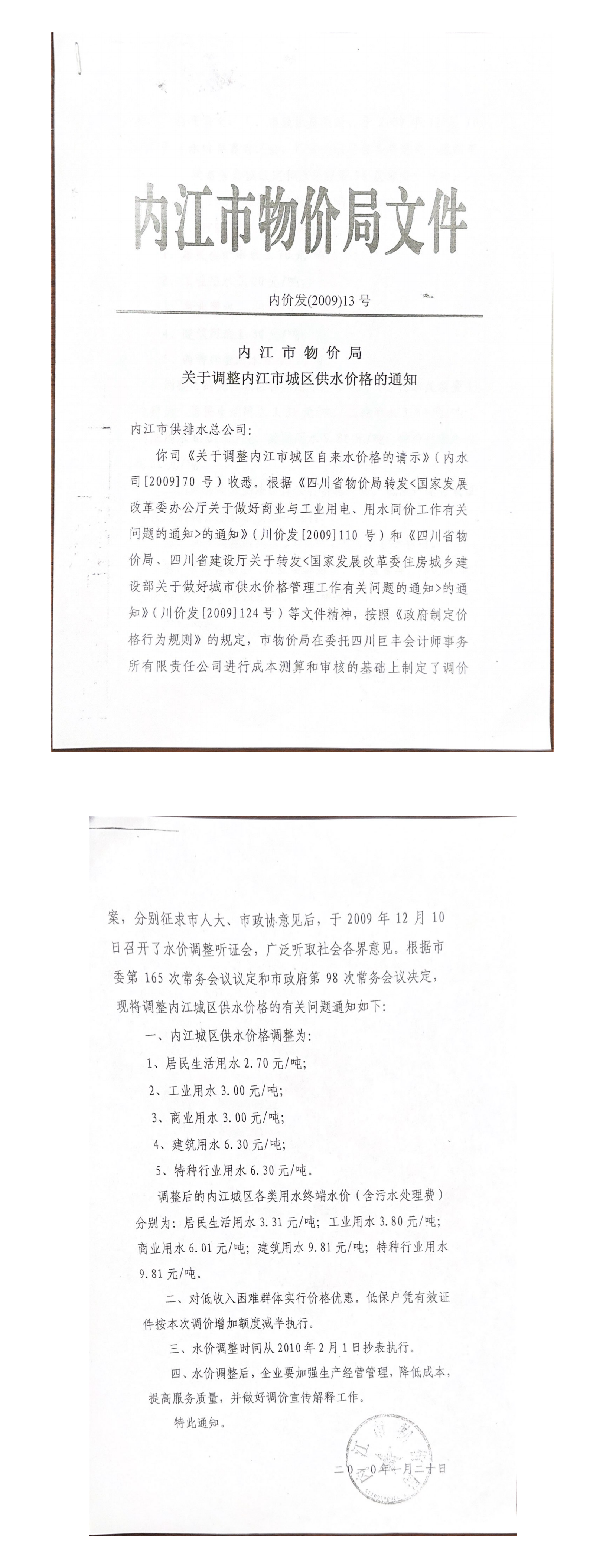内江市物价局关于调整内江市城区供水价格的通知